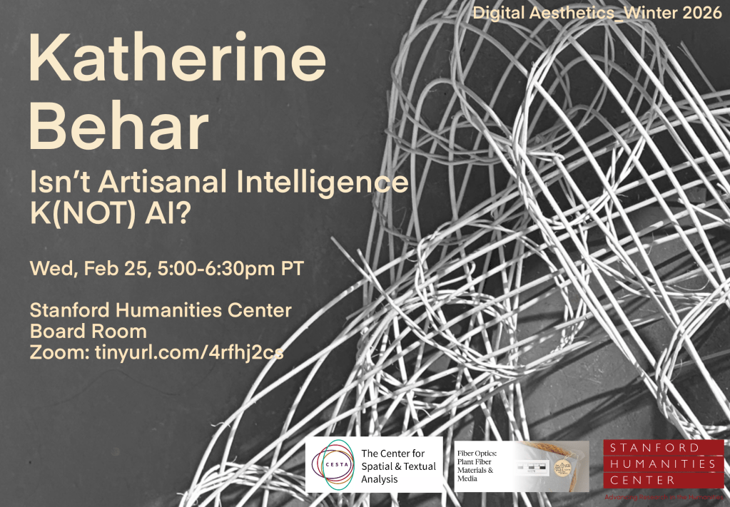 This event is generously co-sponsored by the Center for Spatial and Textual Analysis (CESTA) and Fiber Optics: Materials and Media, a Stanford Humanities Center Research Workshop.